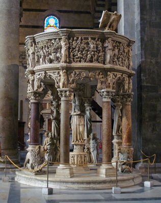 The figures carved on the pulpit display muscular forms and dynamic poses, marking a departure from traditional medieval representations toward more naturalistic expression.