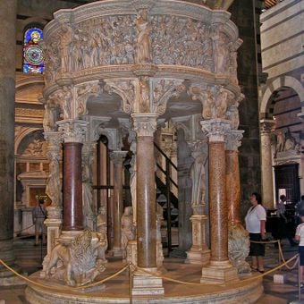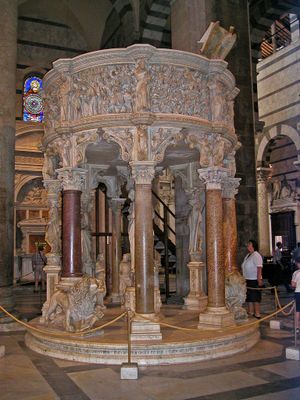The Ambo of Pisa Cathedral features multi-colored columns with capitals supporting allegorical figures and detailed relief work depicting biblical narratives throughout its structure.