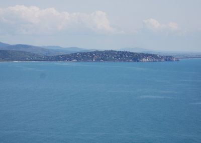 The promontory extends into the Tyrrhenian Sea, featuring Mediterranean vegetation and two dark sand beaches stretching along its coastline.