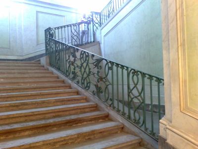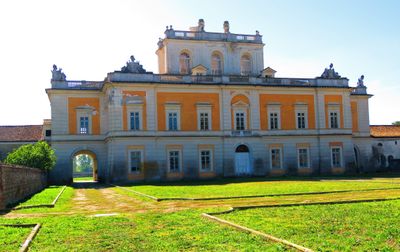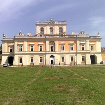 The Royal Palace of Carditello is a large estate near San Tammaro with a two-story central building, symmetric staircases, and extended side wings housing various functions. The entire complex included an elliptical horse racing track, stables, worker housing, and storage areas that organized the property as a working production center.