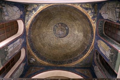 The interior mosaics display one of the earliest known portraits of Saint Ambrose, illustrating the religious art techniques of early Christianity.
