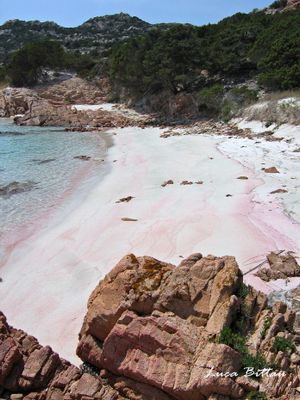 The Pink Beach on Budelli Island in the La Maddalena archipelago gets its color from microscopic marine organisms and coral fragments mixed with particles of granite and other rock. The shoreline stretches about 200 meters and features shallow, clear water that is easily seen from visiting boats.