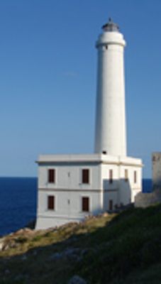 The cylindrical white stone tower rises 32 meters high with a lantern and balcony positioned above a two-story keeper's residence at the easternmost point of Italy.