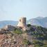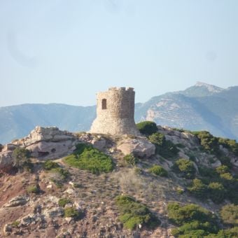 The stone tower stands 10.6 meters tall on the Sardinian coast, featuring thick walls and architectural elements characteristic of Mediterranean fortifications.