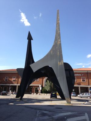 The sculpture stands directly in front of the Spoleto train station, making it the first landmark visitors see upon arrival by rail.