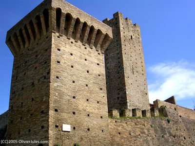 The Torri Montanare consists of two connected defensive structures with a rectangular internal tower and a lower tower at the northwest corner.
