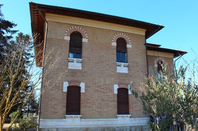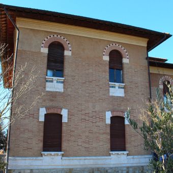 Villa La Rondinella features a quadrangular layout with brick walls adorned by colorful ceramic elements and artistic decorations both inside and outside.