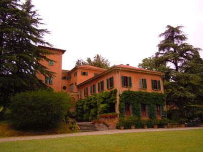 Villa Marescalchi stands on the Bolognese hills, featuring an English-style forest with horse chestnuts, holm oaks, plane trees, and old oaks on one side.