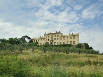 The villa stands at a prominent location in the Arno Valley, featuring an impressive facade designed by architect Gioacchino Fortini in the 18th century.