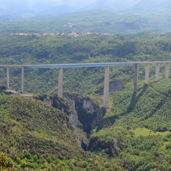 The Italia Viaduct is a highway bridge in Laino Borgo, southern Italy, crossing the gorge of the Lao River with nineteen spans. The structure rises 144 meters above the river and stretches 1161 meters in length through the mountainous landscape of Calabria.