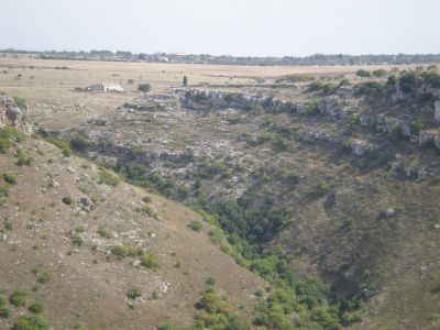 Pulicchio di Gravina is a natural doline in Altamura with a length of about 530 meters (1,740 feet) and width of about 400 meters (1,310 feet), dropping to a depth of about 87 meters (285 feet). The walls slope uniformly inward on all sides, creating a distinctive bowl-shaped cavity in the landscape.