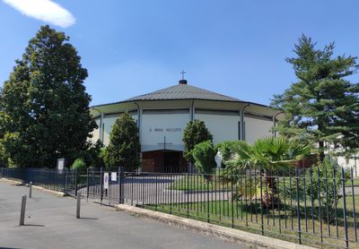 Santa Maria Nascente is a modern church in Milan's experimental QT8 district, built with a circular floor plan and straightforward geometric forms. The interior opens toward the altar without the spatial divisions found in traditional churches, creating a unified worship space.