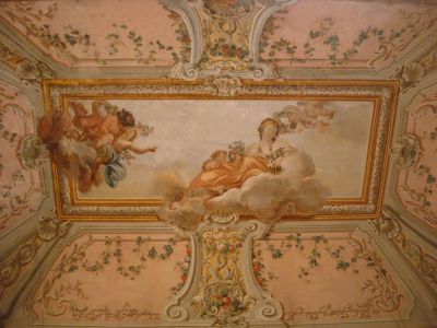 The noble floor contains the throne room with coffered ceilings and Murano chandeliers, alongside frescoed rooms decorated by Roman Baroque school artists.
