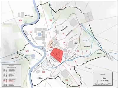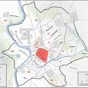 The tenth region of Rome extended over 3.4 kilometers around the Palatine Hill, containing numerous imperial residences and ancient temples.