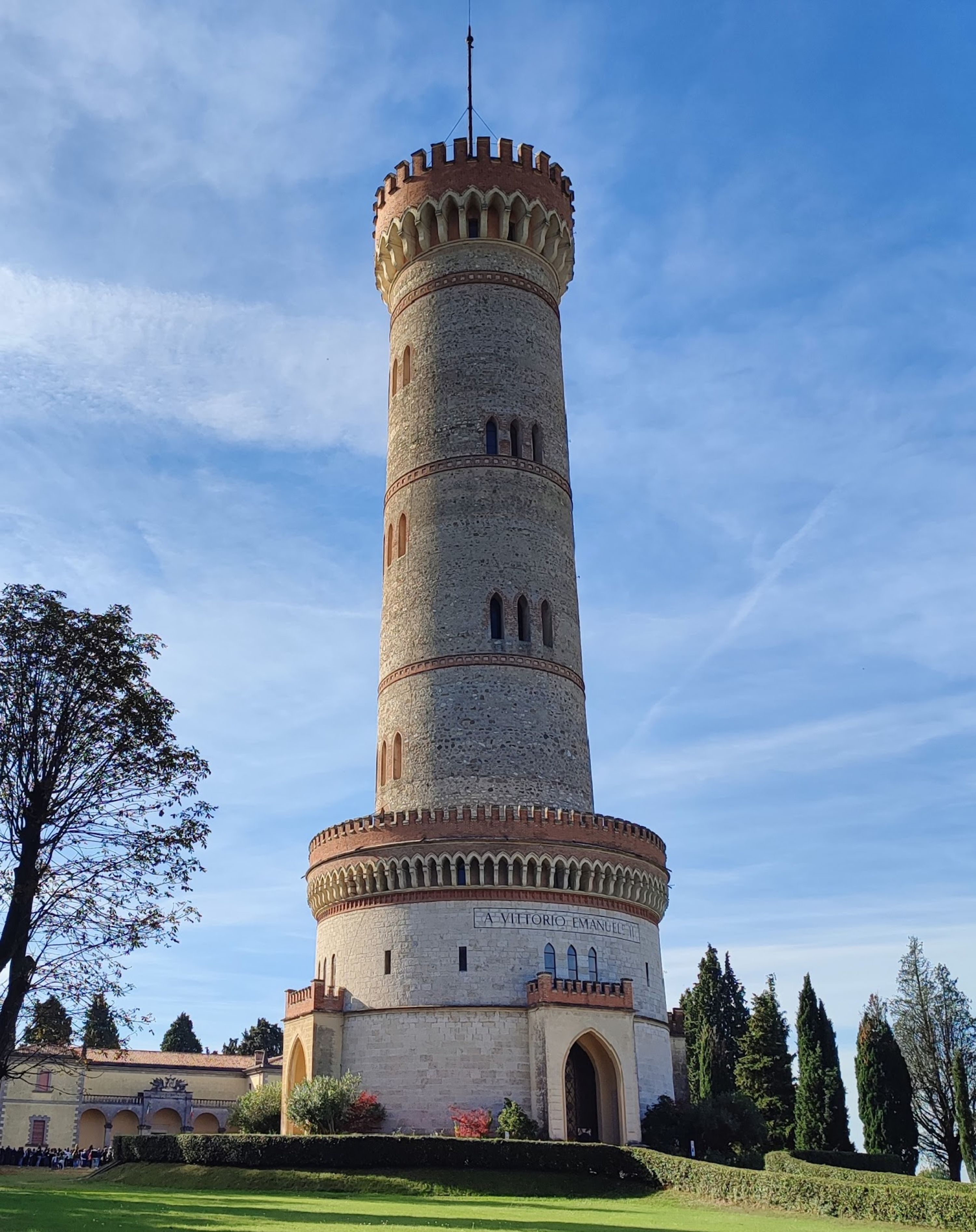 The tower rises 242 feet from a circular foundation measuring 75 feet across, ascending through multiple cylindrical sections to reach a broad observation terrace. A spiral staircase of more than 250 steps leads through interior spaces featuring wall paintings and artistic representations. The adjacent museum displays military artifacts, uniforms and documents from the Second Italian War of Independence.