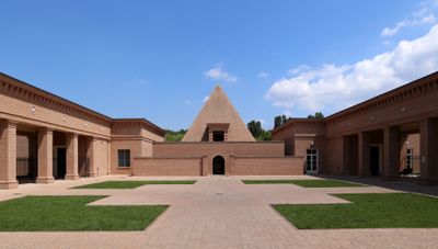 At the center of the eight-pointed star-shaped labyrinth stands a pyramid-shaped chapel, surrounded by arcades and exhibition halls displaying Ricci's typography collection.