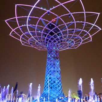 The name refers to a mythical tree symbolizing life and growth, chosen to express Italy's ability to produce food and energy during the world exposition. Today families and students from the nearby science park visit the installation and watch how water and light transform the metal structure.