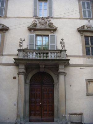 The facade of Palazzo Terzi presents a grand entrance with Tuscan columns, allegorical sculptures, and intricate architectural details spanning multiple floors.