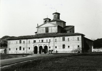 The Barco Ducale stands near the Metauro River, featuring a Latin cross church at the center of an extensive building that houses former convent spaces.