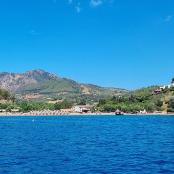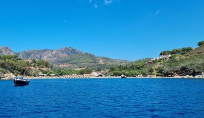 The 160-meter-long Barbarossa beach contains fine dark shingle mixed with sand, facing south towards the Calamita peninsula and Monte Capanne mountains.