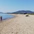 The four-kilometer stretch of coastline features white sand mixed with pebbles and shell fragments alongside turquoise waters leading to deep seabeds.