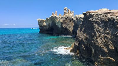 Natural rock formations create secluded swimming areas with clear water visibility down to twenty meters, revealing diverse marine life.