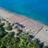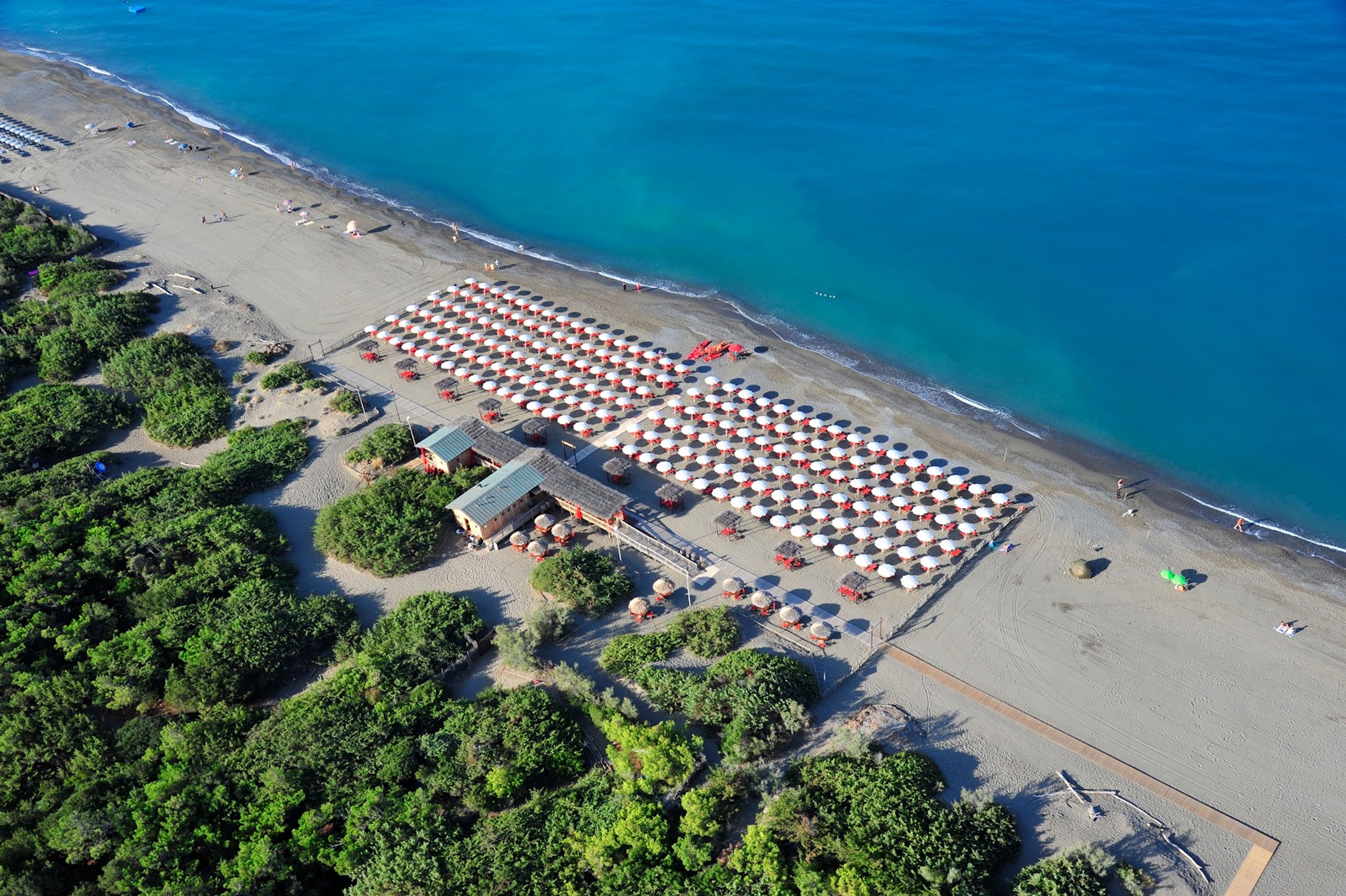 The beach features brown coarse-grained sand extending along the Tyrrhenian Sea coast, bordered by Mediterranean vegetation and pine trees.