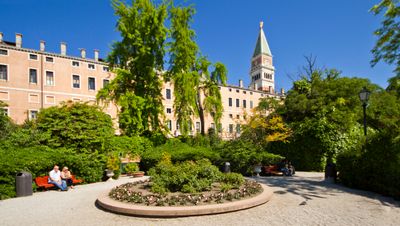 Giardini Reali is an urban park with open green spaces and structured areas right next to Saint Mark's Square. The space is crossed by long pathways lined with well-maintained plants and pergolas covered in wisteria.