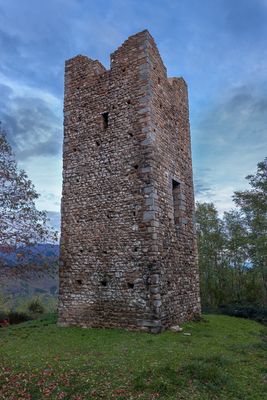 Two stone towers stand at different heights within the remains of the Securana fortress, commanding views over the Lima Valley and Pistoia Apennines.