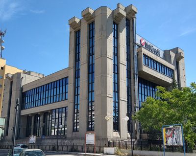 Ex palazzo della Banca Popolare di Pescopagano, Postmodern bank building in Pescopagano, Italy.