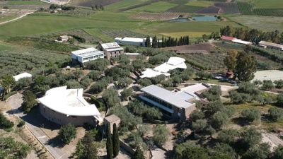 Visitors can explore multiple buildings spread across the property, including agricultural areas with olive trees, almond groves, and vegetable gardens.