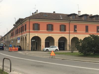 The Borgo Calvenzano stretches along Viale Bligny with a continuous portico featuring rounded arches and two-story buildings arranged in a row formation.