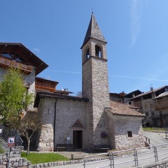 The Saints Sebastian and Roch Church stands with stone walls against the mountain slopes, featuring Gothic and Baroque architectural elements within its structure.