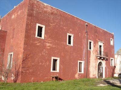 The building combines traditional architectural elements with distinct red coloring, creating a contrast against the limestone trulli houses of Alberobello.