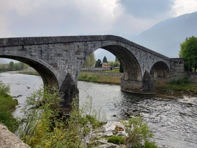 The Ponte di Ganda spans across the Adda River with three arches, featuring a central arch higher than the two lateral ones.