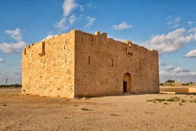 The three-story rectangular structure constructed from basalt and limestone features thick walls and strategic defensive positions overlooking the surrounding desert landscape.