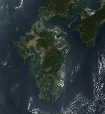 Kyushu spans 36,782 square kilometers with a coastline of 3,888 kilometers and reaches its highest point at Mount Nakadake at 1,791 meters.