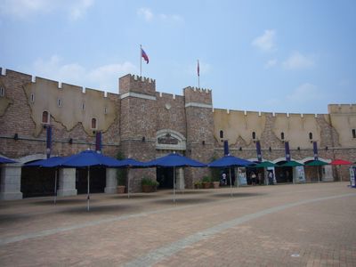 The park design incorporates Mediterranean port city elements, featuring architectural styles from Spain, Italy, and Greece throughout its various sections.