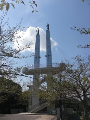 Bronze statues of Yamato Takeru-no-Mikoto and Ototachibana-hime face each other atop the tower's twin steeples, connecting to Japanese mythology.