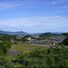 The village spreads across gently rolling terrain with rice terraces and Buddhist temples set among the fields. Several stone monuments and burial mounds lie scattered throughout the landscape, connected by country paths.
