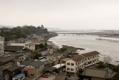 The reconstructed Kitsuki Castle, measuring as Japan's smallest fortress, stands on a coastal plateau overlooking the Seto Inland Sea.