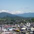 The Iwamura Castle Ruins sit on one of the highest elevations of any Japanese castle and overlook traditional wooden buildings below. The view reveals the traditional hillside layout of this region.