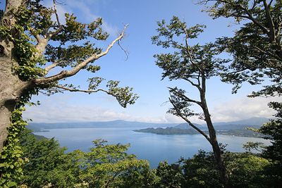 Lake Towada spans 61 square kilometers at 400 meters elevation, featuring deep blue waters and two peninsulas extending from its southern shore.