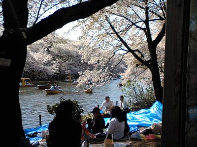 The name means "source of the head water" because the spring here once supplied drinking water to Edo. Today families come to picnic under cherry trees and couples avoid rowing together because of old beliefs.