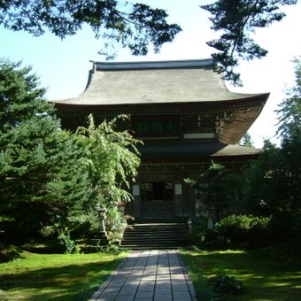 Daijō-ji is a Zen temple set in a rural mountain village with structures including a main hall, meditation space, and residential quarters for monks. The grounds are positioned on elevated terrain overlooking the surrounding landscape.