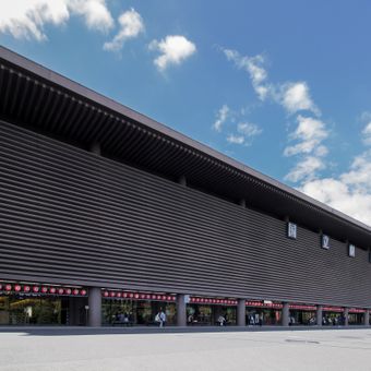 The exterior of the main building incorporates design elements from azekura-zukuri style, an ancient construction method using horizontally stacked timber logs originally seen at the imperial treasury building Shōsōin. This architectural reference visibly connects the modern theatre with historical Japanese building traditions.