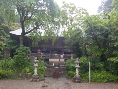 The Saimyō-ji temple stands on a mountainside, featuring traditional Japanese architecture with a main hall for Buddhist ceremonies and rituals.
