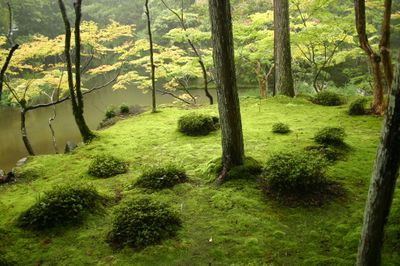 This Rinzai Zen temple contains two gardens with over 120 moss varieties covering stones, pathways, and tree roots across multiple levels of landscaping.