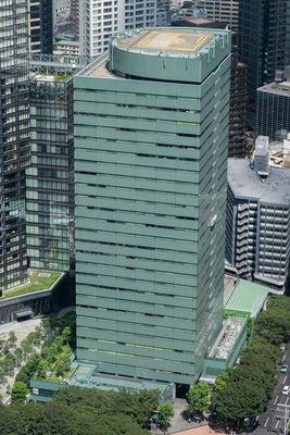 The structure, designed by Nikken Sekkei, incorporates environmental elements that set standards for sustainable architecture in Tokyo's business district.