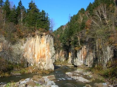 The Sounkyo gorge extends over 24 kilometers with 100-meter-high cliffs along the Ishikari River within Daisetsuzan National Park in Hokkaido.